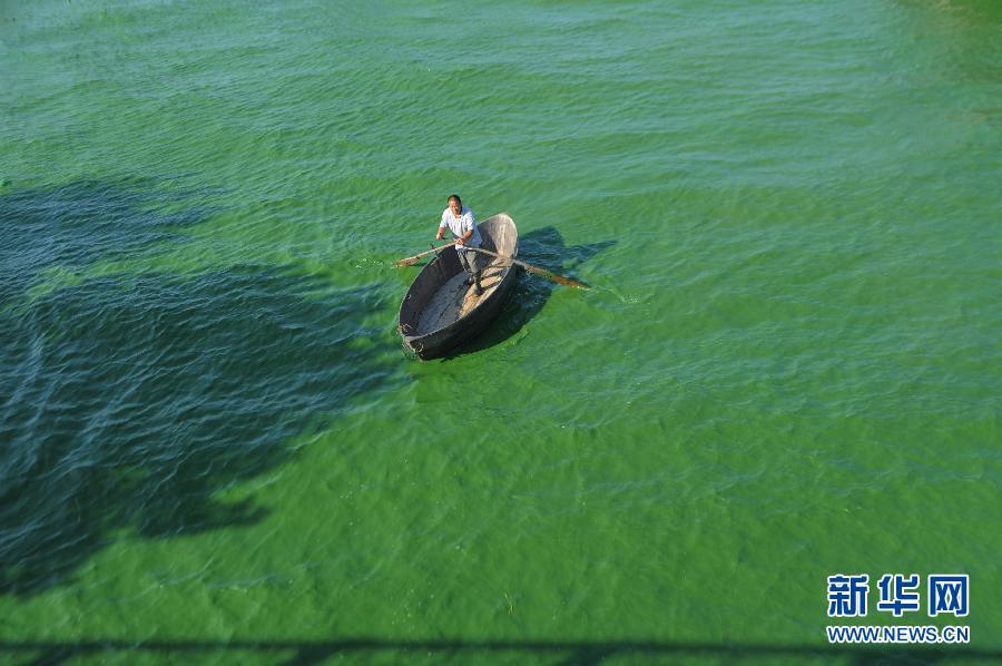 A fisherman rows a boat in the Chaohu Lake full of blue-green alga on July 30, 2015. As the temperature keeps climbing in summer,