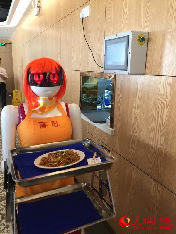 A restaurant in Haikou city, south China's Hainan Province uses a lovely robot waitress to serve food, which attracts a lot of customers. (Photo/ People’s Daily Online)
