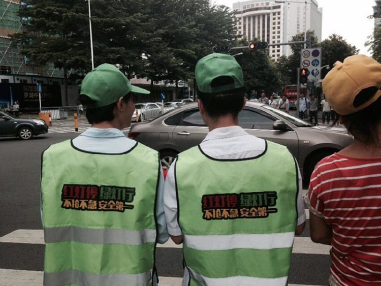 Instructors wears green jackets and hats promoting safety awareness among other pedestrians.(Photo/ youth.cn)