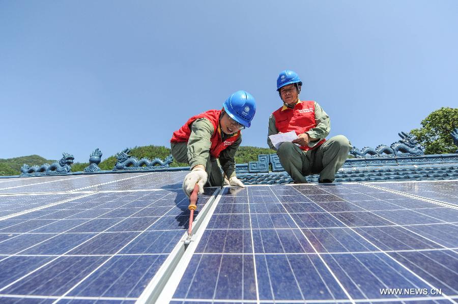Power department staff set up rooftop PV power systems in Hesilu village of Yiwu, east China's Zhejiang Province, Aug. 6, 2015. More than 50 families in the village have installed PV power systems on rooftops, which cover an area of 10,000 square meters. (Xinhua/Xu Yu)