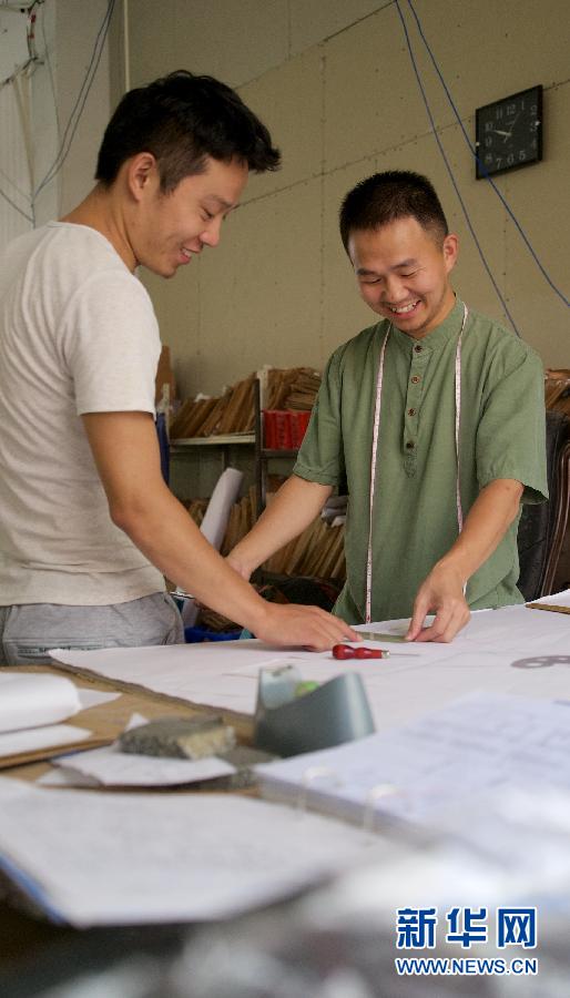 Wan Yan’gang (right) and the employed staff make patterns for the clothes. (Photo by Hu Chenhuan / Xinhua)