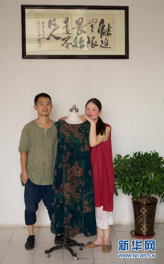 The couple show the clothes that sell well recently to the reporter. (Photo by Hu Chenhuan /Xinhua)