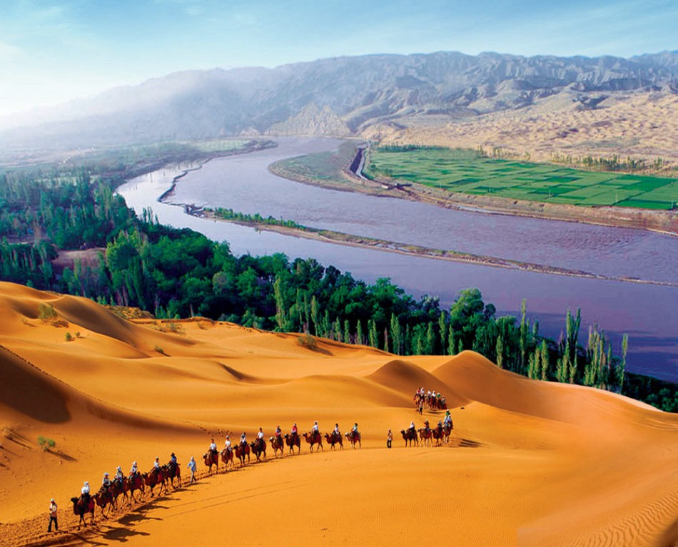 Shapotou Tourism Area lies on the southeastern rim of the Tengger Desert with breathtaking scenery of desert dunes, the Yellow River and lush farmlands.