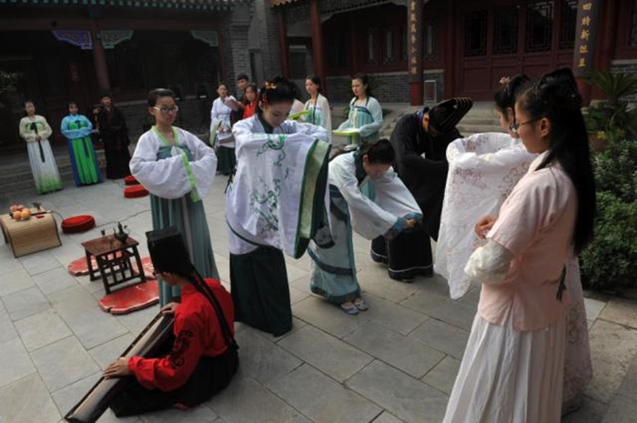 More than 20 belles wearing traditional costume present a coming of age ceremony in Liaocheng, Shandong province on Aug. 10. Traditionally Chinese men became adults at the age of 20 during the capping ceremony. Women became adults at the age of 15 during the hairpin ceremony. Historical evidence shows that those ceremonies date back to the period of Zhou Dynasty (1045 BC–256 BC). (CNS/Xu Wenhao)