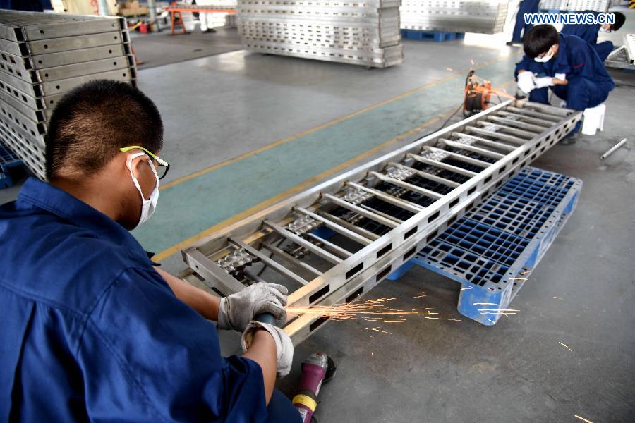 Workers polish new guardrails at a factory in Dachang county, north China's Hebei Province, Aug. 12, 2015. (Xinhua/Wei Mengjia)
