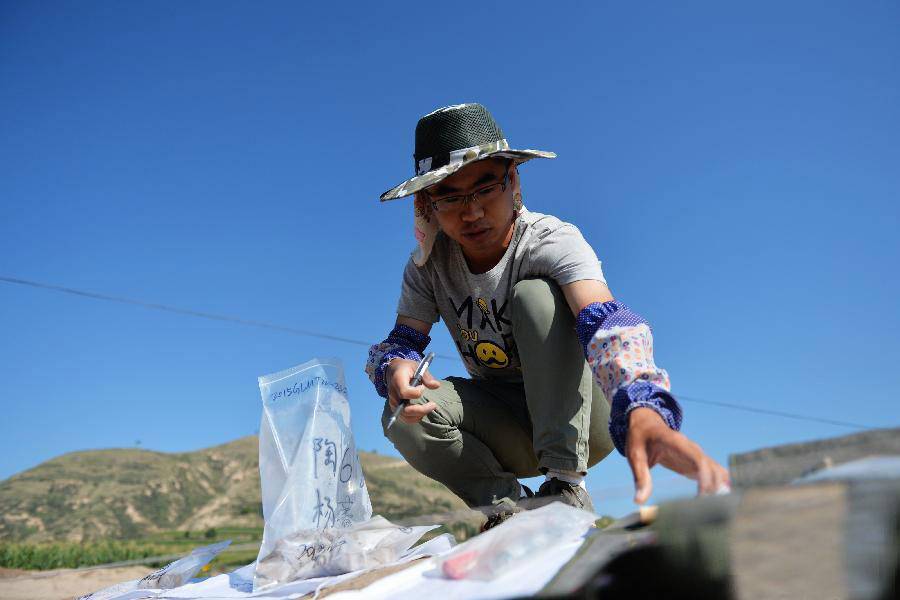 Zhang Xiaoru, a member of the archaeological team, is at work at the site of Majiayao Culture on Aug. 11, 2015. (Xinhua/Chenbin)
