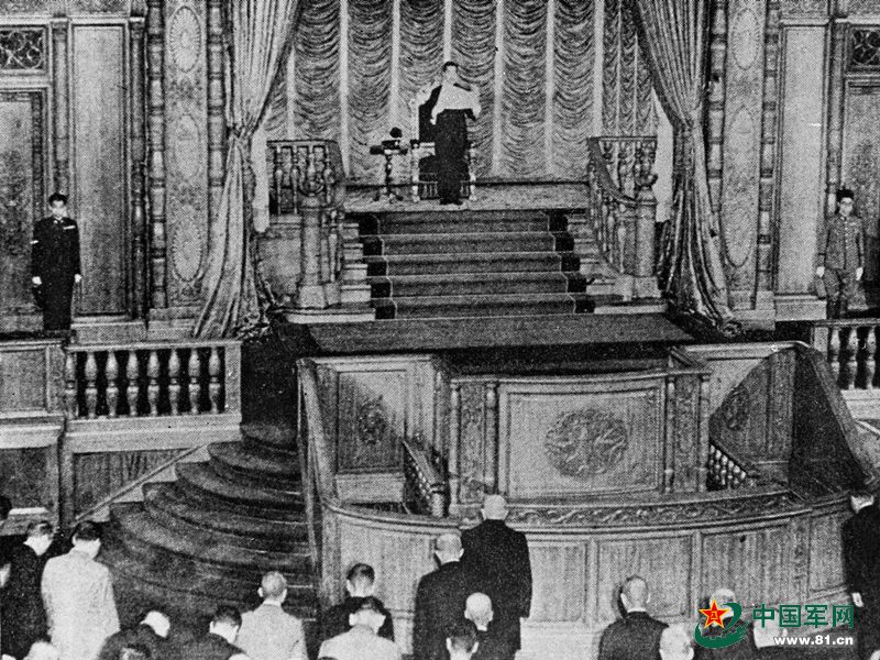 The emperor of Japan announces to the Japanese parliament the decision to accept the Potsdam Proclamation and surrender to the Allies on Aug. 14, 1945. (File photo/81.cn)