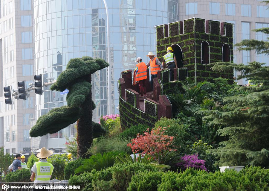 Great Wall-shaped flower terrace to celebrate the V-day parade in Tiananmen Square