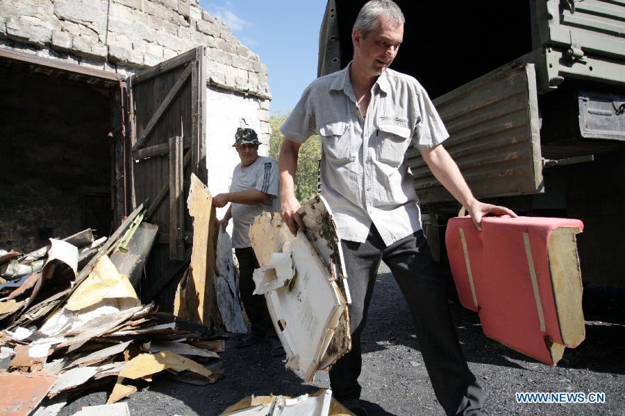 Picture taken on Sept. 16, 2015 shows debris from the Malaysia Airlines flight MH17 collected by local residents in the village of Rossipne, in the Donetsk region, eastern Ukraine. The final report on the cause of the MH17 crash will be made public on Oct. 13. (Xinhua/Alexander Ermochenko)
