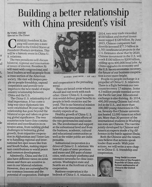On September 21, 2015, Seattle Times, one of the largest English newspaper in Washington state, published Chinese State Councilor Yang Jiechi’s article “Building a Better Relationship with China President’s Visit”.