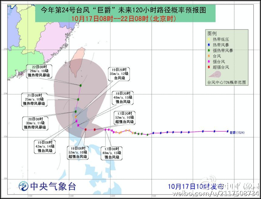 BEIJING, Oct. 17 -- China's National Meteorological Center (NMC) on Saturday morning renewed its forecast for the approaching Typhoon Koppu, which is expected to batter China's southeastern regions.