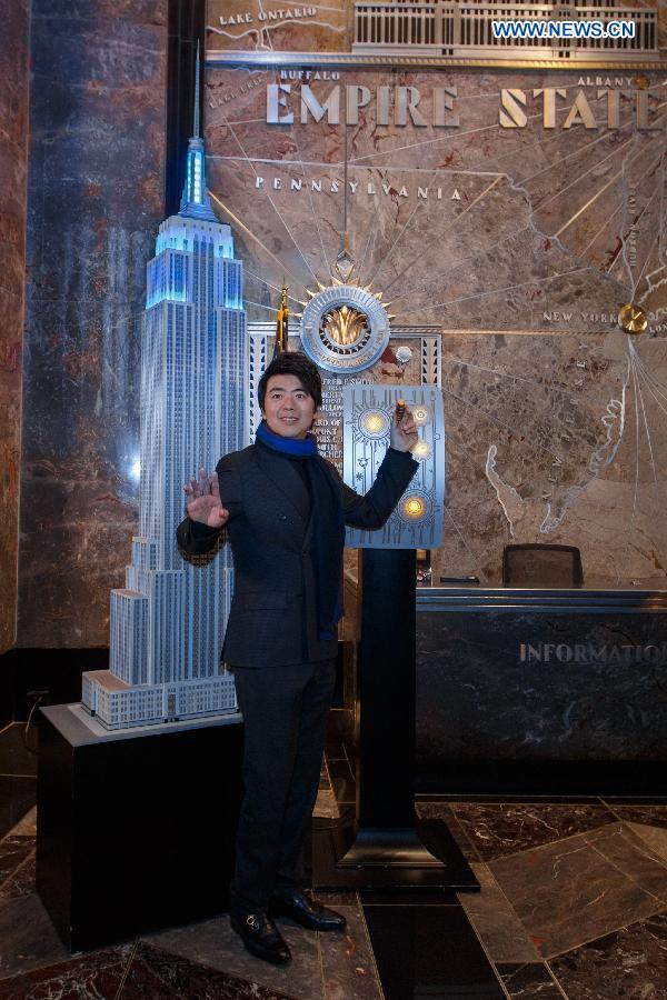 Chinese pianist Lang Lang poses for a photo after United Nations Secretary-General Ban Ki-moon symbolically turned on a switch at Empire State Building for the UN Blue campaign in New York, Oct. 23, 2015. From the Sydney Opera House in Australia to the Great Pyramids of Giza in Egypt, more than 200 of the world's most iconic landmarks will be lit United Nations blue when the sun sets on Oct. 24 to mark the 70th birthday of the global organization. [Photo: Xinhua]