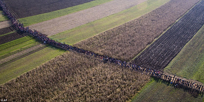 The column of migrants was filmed from the sky as it weaved through fields in Rigonce, Slovenia, after having passed into the country from Croatia.