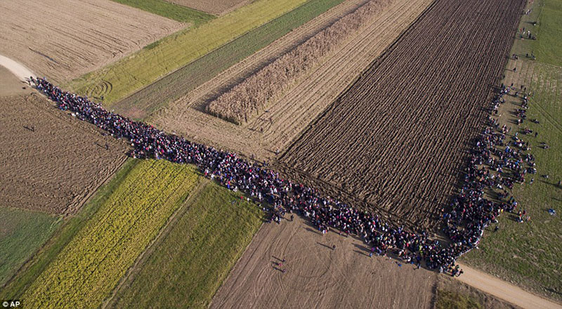 •Photographed from above, the refugees formed a single column as they crossed into the country from Croatia