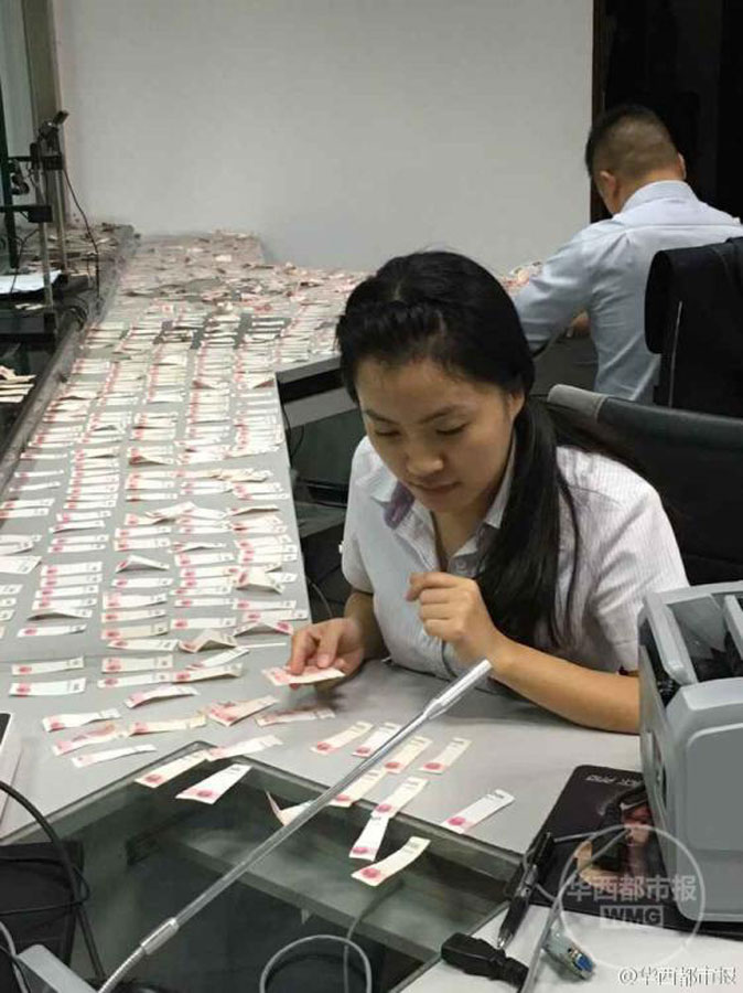 A local employee repairs the RMB notes torn into pieces by Mr. Luo in southwest China's Sichuan Province. [Photo: huaxi001.com.cn]