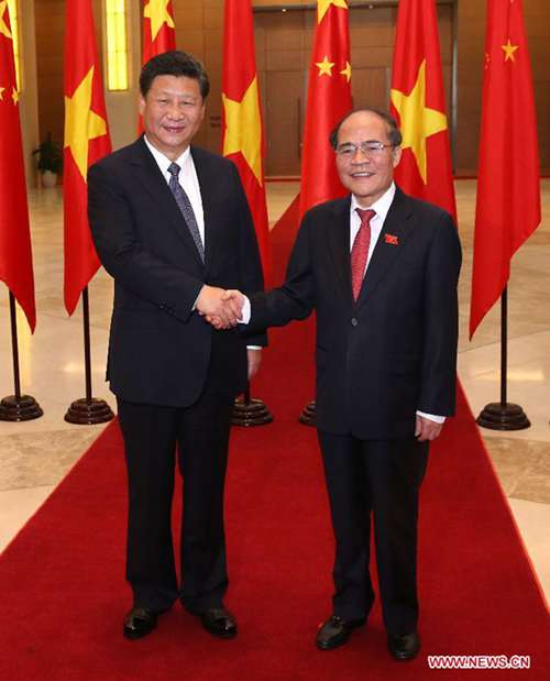 Chinese President Xi Jinping meets with Vietnamese National Assembly Chairman Nguyen Sinh Hung in Hanoi, Vietnam on Nov. 6, 2015.
