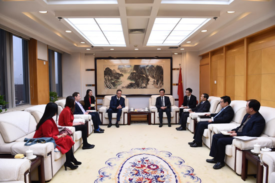| Secretary General of the People’s Daily, Wang Yibiao, who is also a member of the Editorial Board of the People’s Daily, meets with Martin Clarke, Editor-in-Chief of Mail Online Thursday morning. (Photo by Yu Kai) |
