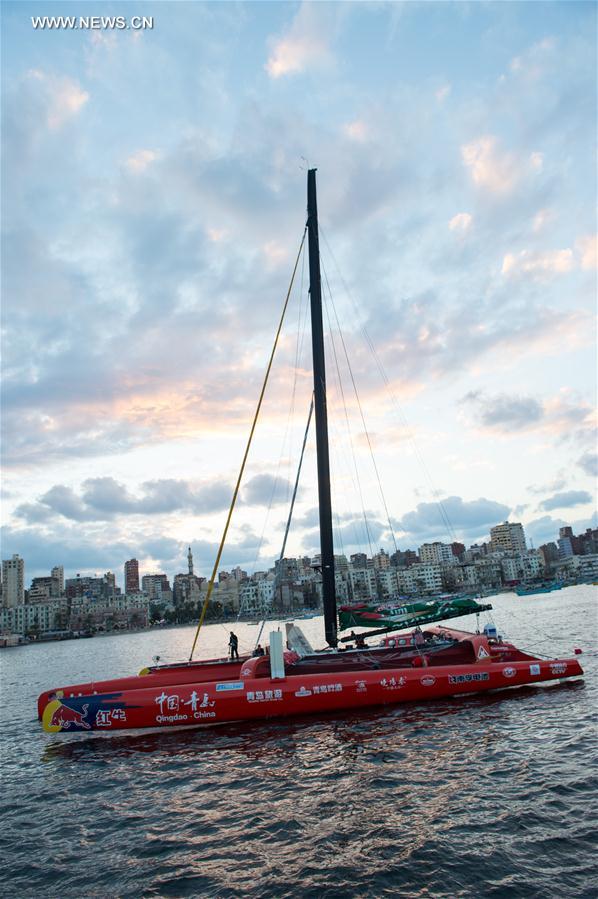 The super trimaran "Qingdao China" anchors at a wharf in Alexandria, Egypt, Dec. 11, 2015. The super trimaran "Qingdao China" harbored on Friday in the Mediterranean port of Alexandria in Egypt as a stop in its journey along the 21st Century Maritime Silk Road. (Xinhua/Meng Tao)