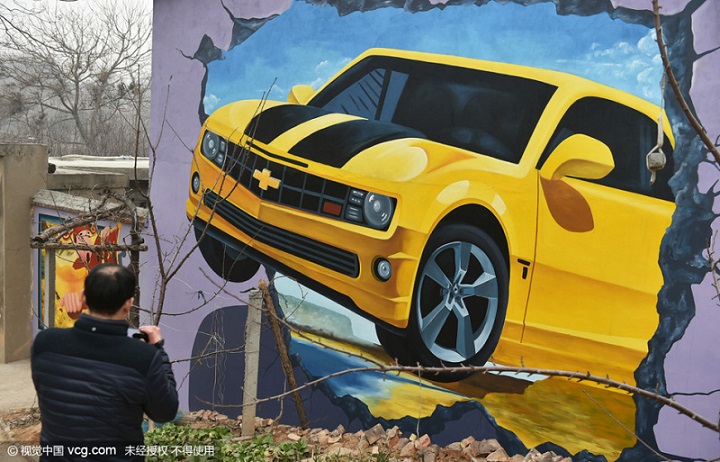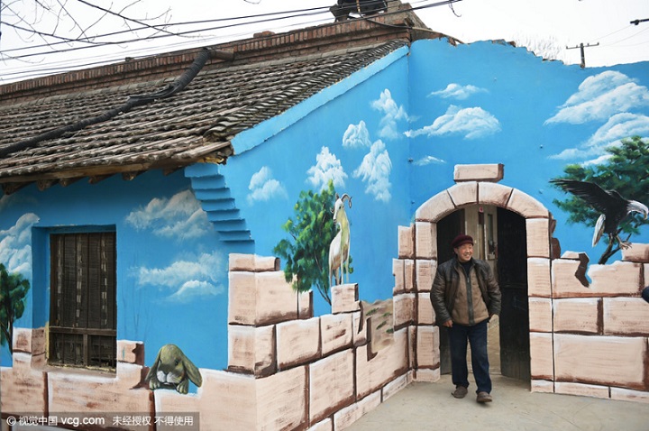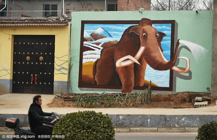 Photos taken on January 5, 2016, show the 3D paintings in Cijian county, Luoyang, central China’s Henan province. The county invited artists to decorate their walls along the street into a fashionable art gallery.