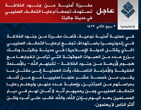 “A group of soldiers of the caliphate in Indonesia targeted a gathering from the crusader alliance that fights the Islamic State in Jakarta through planting several explosive devices that went off as four of the soldiers attacked with light weapons and explosive belts,” the group said in a statement.