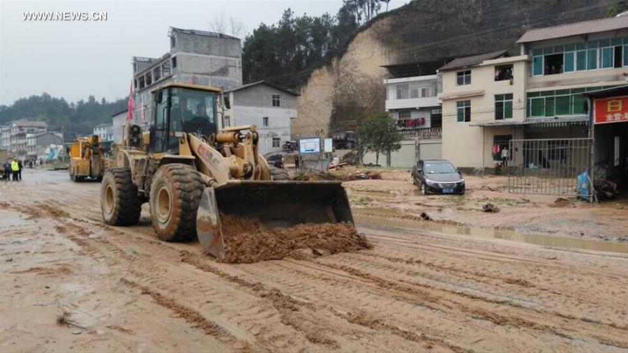 Photo taken with a mobile phone shows rescuers clearing the debris after the dike of a barrier lake collapsed in Longfeng Township of Enshi Tujia and Miao Autonomous Prefecture, central China's Hubei Province, Jan. 14, 2016. The collapse happened on Thursday noon, with water flooding a nearby village and inundating cars in the village downstream. No casualties have been reported yet. [Photo: Xinhua]