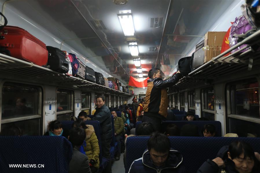Passengers arrange their luggage on a train heading from China's capital Beijing to southwest China's Chongqing, Jan. 24, 2016. (Xinhua/Xing Guangli)