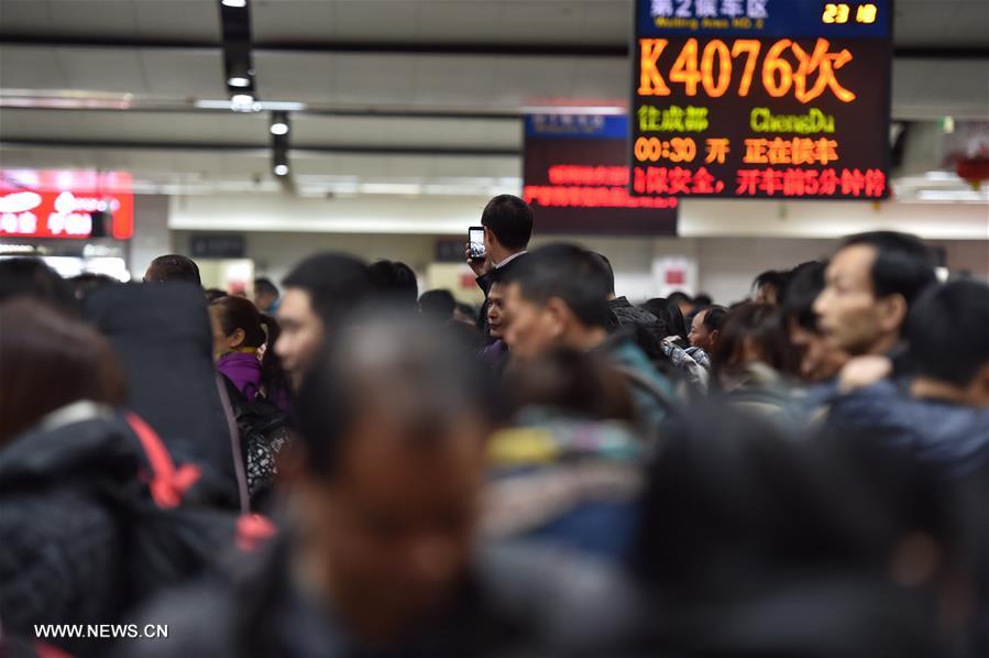 Passengers wait to board K4076 train, the first extra train for the 2016 Spring Festival travel rush from the railway station of Shenzhen, south China's Guangdong Province, to Chengdu, southwest China's Sichuan Province, on Jan. 24, 2016. (Xinhua/Mao Siqian)