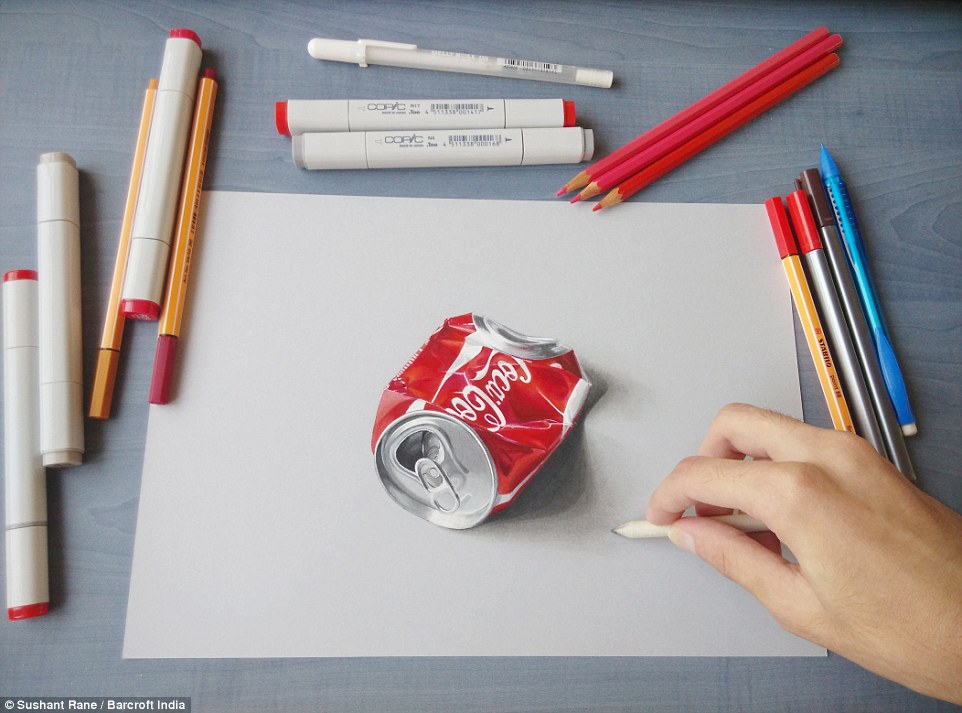 A 19-year-old art student Sushant Sushil Rane has created some amazing 3D-drawings such as an empty coffee mug and a cracked egg – all of which convey an impression of standing out from the drawing sheet like real objects.