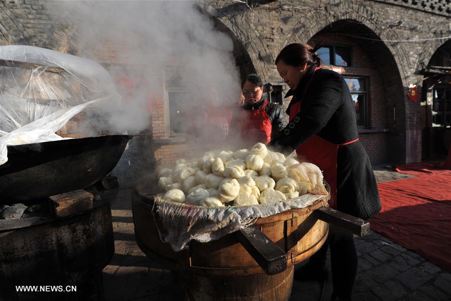Women serve a wedding feast at Xiazhuang Village in Xiaoyi City, north China's Shanxi Province, Feb. 2, 2016. A local young couple held their traditional wedding ceremony at the farmyard, involving all the villagers. (Xinhua/Zhan Yan)