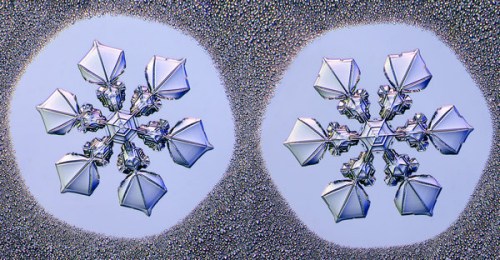 Dr. Libbrecht found that by placing two crystal seeds next to each other and growing them under the exact same conditions, he could create two snowflakes with nearly the same intricate shapes and patterns.