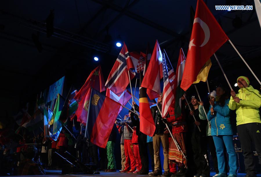 Athletes from different nations and regions hold flags during the closing ceremony for the Lillehammer 2016 Winter Youth Olympic Games in Lillehammer, Norway on Feb. 21, 2016. (Xinhua/Han Yan)