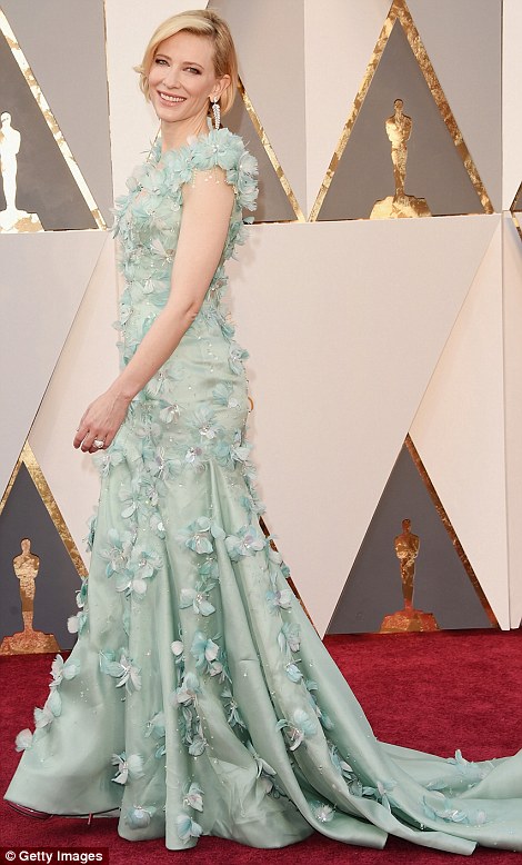 Hello petal: Cate Blanchett showcased her quirky style in a pale blue gown which was embellished with feathered flowers