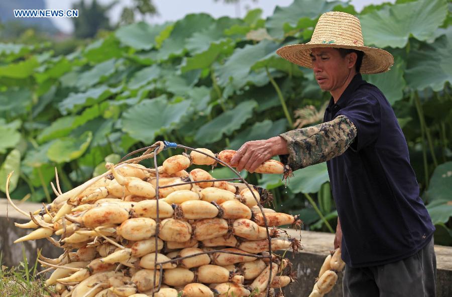 A farmer carries fresh lotus roots to a collection spot at Santang Village of Dapu Town in Liucheng County, southwest China's Guangxi Zhuang Autonomous Region, June 17, 2015. As the harvest season of lotus roots comes, farmers here were busy with picking up lotus roots.