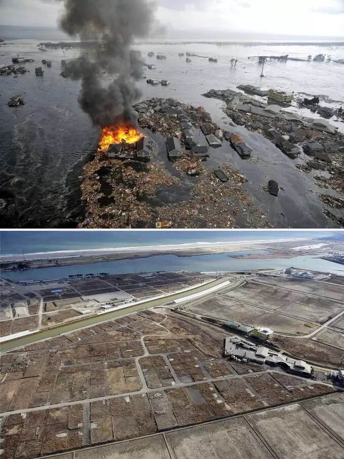 Natori city in Miyagi prefecture on March 11, 2011 (top) and February 15, 2016 (bottom)