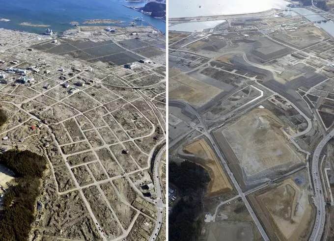 Rikuzentakata city in Iwate prefecture on April 5, 2011 (L) and February 16, 2016 (R)