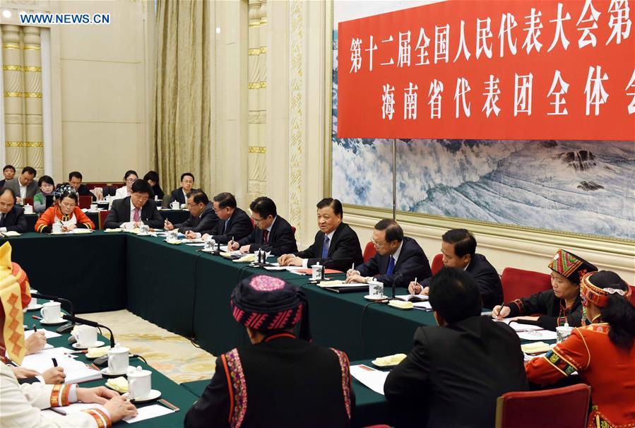 Liu Yunshan, a member of the Standing Committee of the Political Bureau of the Communist Party of China Central Committee, joins a group deliberation of deputies from Hainan Province to the annual session of the National People's Congress in Beijing, capital of China, March 9, 2016. (Xinhua/Rao Aimin)