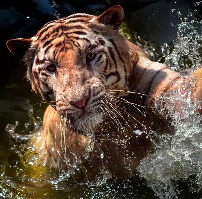 The tiger was taking a dip during feeding time which offered Fahmi the chance to get a particularly brilliant snap of the tiger's ferocious face as it emerged from the water.
