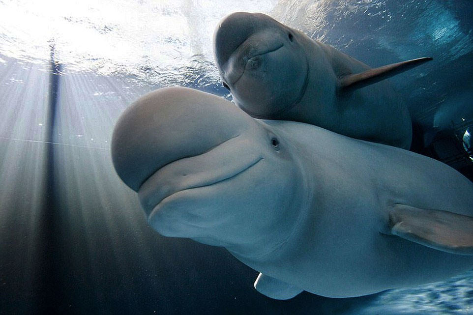 How deep is your love? A beluga whale calf sticks close to its mother in Chicago, Illinois, at the largest indoor aquarium in the world
