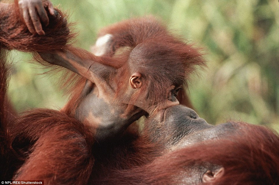 Mwah! A baby orang-utan puckers up to its mother in Borneo, the third-largest island in the world, in this cute snap from Southeast Asia