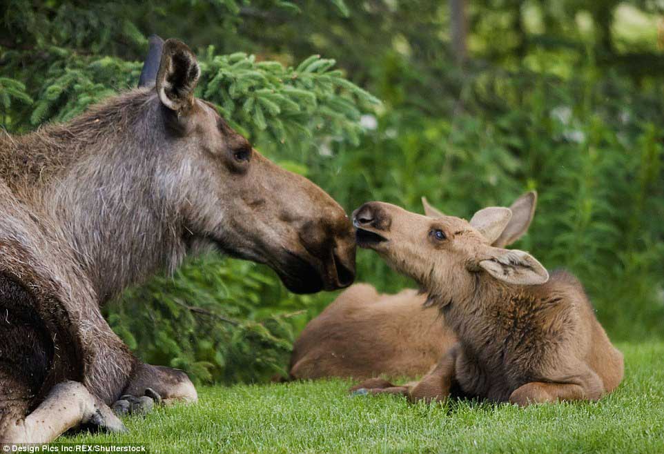 A-moose bouche: A moose and her young calf nuzzle up in the back garden of a home in Anchorage, the largest city in Alaska
