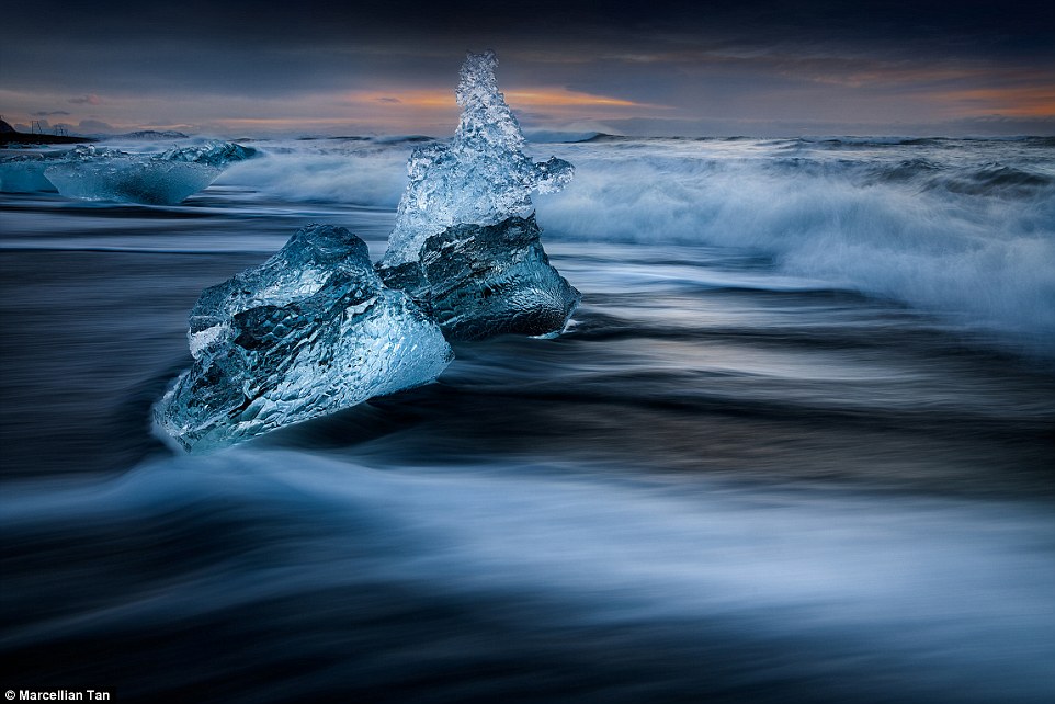 Icebergs on Jokulsarlon black sand beach in Iceland: To take this image Tan had to brave big waves which was quite challenging, he said