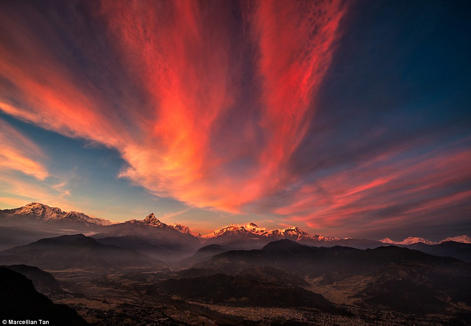 A blazing sunset in Nepal: Tan said he likes to hone in on 'interesting subjects, beautiful lighting, and not to include items that will distract viewers.'