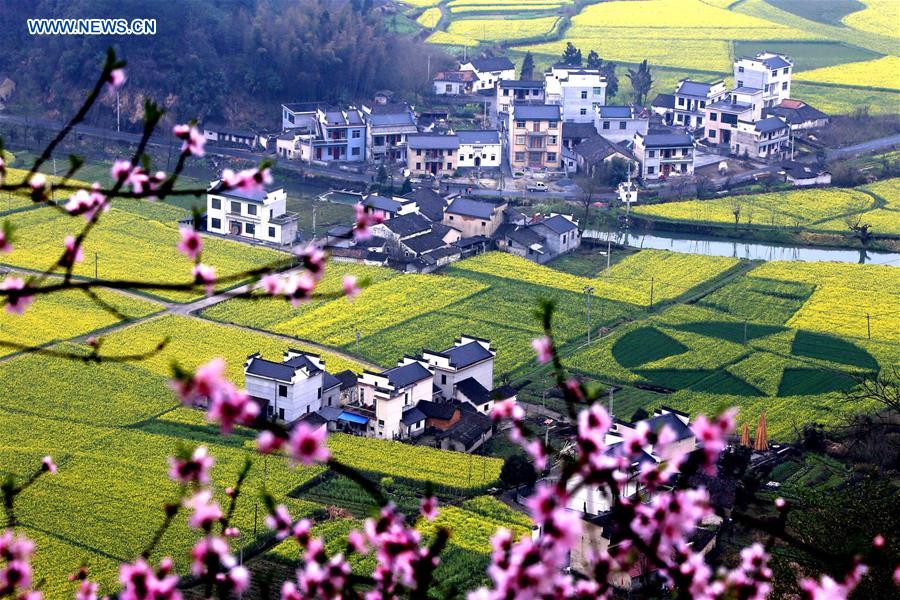 HUANGSHAN, March 22, 2016 -- Photo taken on March 21, 2016 shows the scenery of rape flower fields in Kecun Village of Yixian County in Huangshan City, east China's Anhui Province. Rape flowers and Hui-style architectures here combine to create an attractive landscape painting. (Xinhua/Shi Guangde)