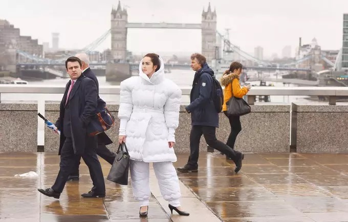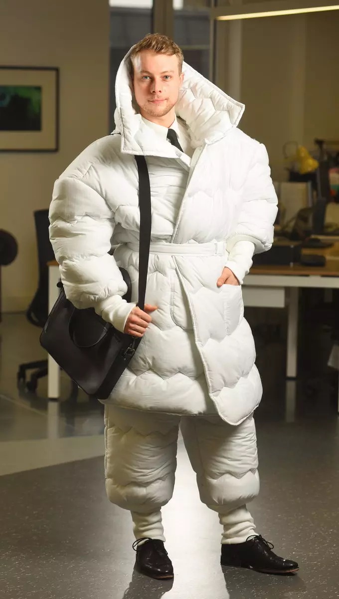 The extremely puffy outfit is made from 100 percent cotton and feathered duvets, and is held together by a sturdy belt. The collar can serve as a pillow if you want.