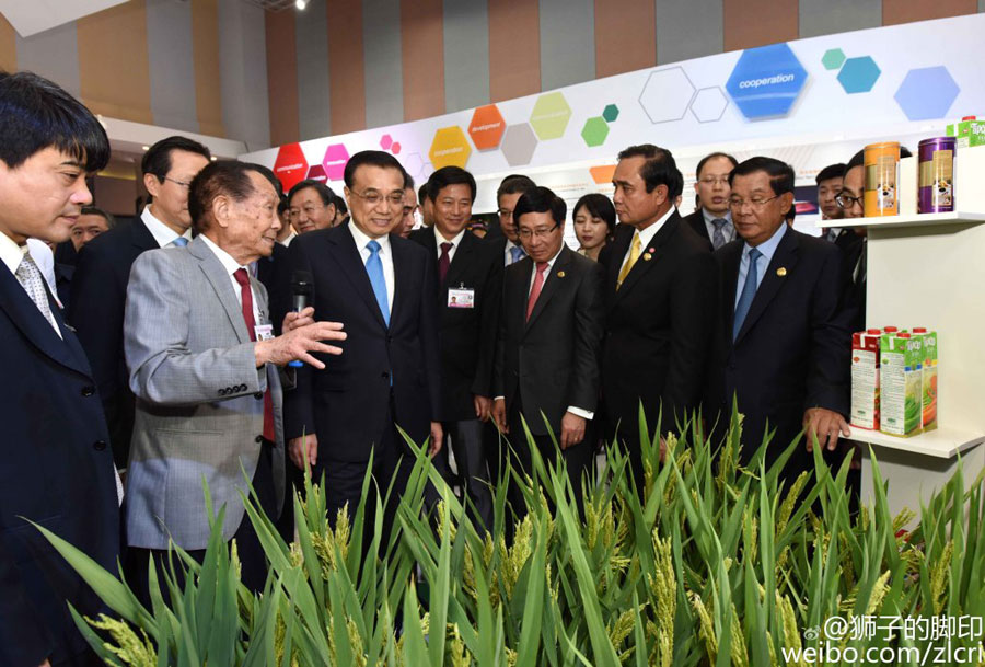 Chinese Premier Li Keqiang and five leaders of the Lancang-Mekong countries visit an exhibition highlighting cooperation between their respective countries in Sanya, a city in southern China's Hainan province, March 23, 2016. [Photo: weibo.com]