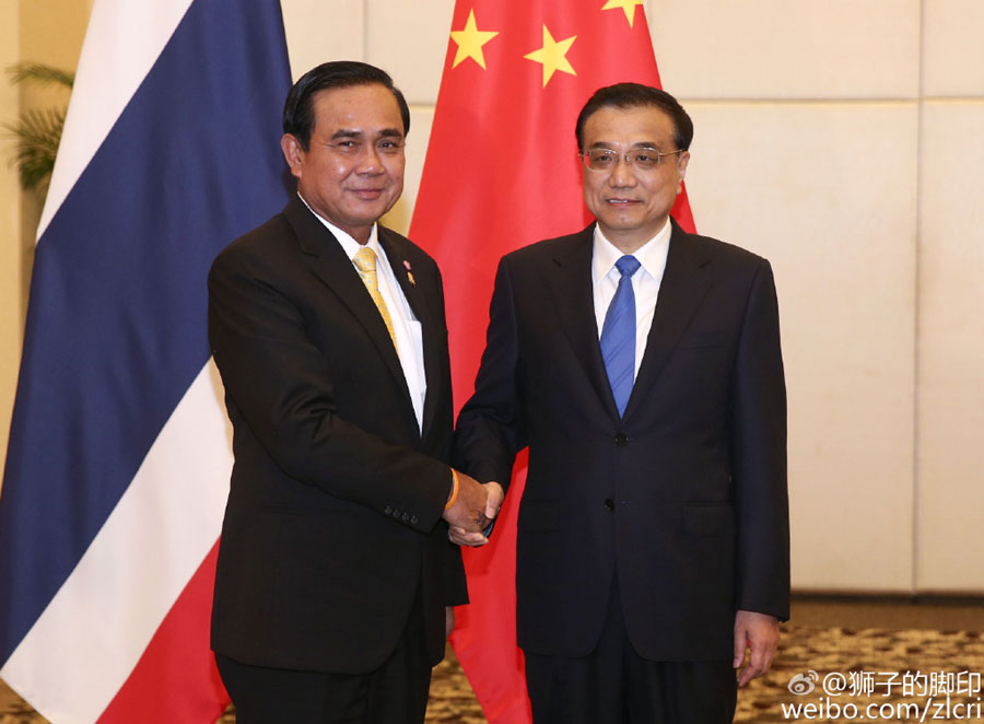 Chinese Premier Li Keqiang (R) meets with Prime Minister of Thailand Prayut Chan-o-cha in Sanya, a city in southern China's Hainan province, March 23, 2016. [Photo: weibo.com]