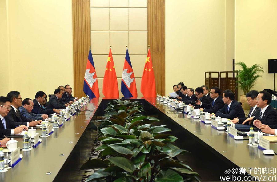 Chinese Premier Li Keqiang meets with Prime Minister of Cambodia Hun Sen in Sanya, a city in southern China's Hainan province, March 23, 2016. [Photo: weibo.com]