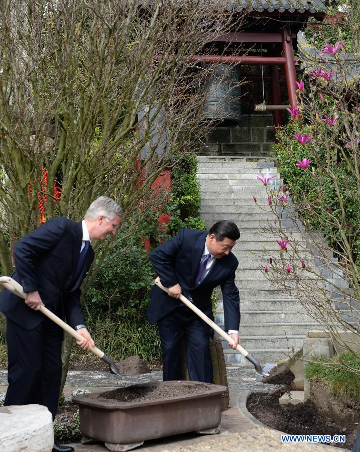 Chinese President Xi Jinping (R) and Belgian King Philippe shovel soil on a magnolia tree that symbolizes friendship at the Pairi Daiza zoo in Brugelette, Belgium, March 30, 2014. Xi and Belgian King Philippe attended the inauguration of a panda house at the zoo.