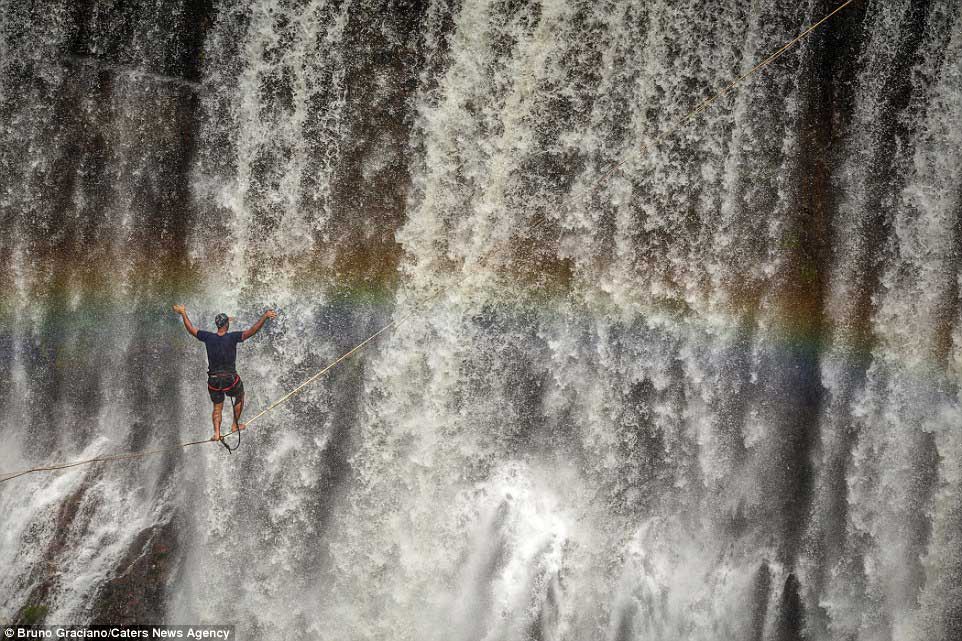 Graciano, 29, spent a number of days shooting highliners above the falls during his visits to them between November 2015 and March 2016