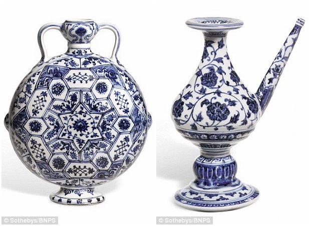 High value items: The most expensive item, a 9in blue and white Moon Flask from the 15th century, pictured left, fetched £10.1million. A holy water vessel from the same period, pictured right, achieved £9.1million